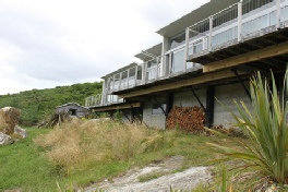 A modern bach, but very basic furnishings and accessories The dwelling is primarily designed to be a shelter Open plan kitchen/dining and lounge area with large folding doors for indoor/outdoor flow Sleeping for large groups is 'bunk down' style with roll out mattresses/stretchers Note- CD player with jacks for DVD and iPod, fireplace, fridge/freezer, dishwasher, gas hob, electric oven, microwave, coffee plunger, bath, shower, highchair, games, kids toys (mostly baby age) |