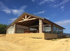 2 large decks, one of which access the interior fireplace from the outside House is very modern ad brand new, running on solar power and LPG Open plan living of kitchen and lounge. Large outdoor dining table outside Master bedroom has own spacious ensuite A second bathroom accommodates the other bedrooms with a shower only, toilet and laundry area Internal/external fireplace, Freeview TV, fridge/freezer, breakfast bar, beer fridge on deck, double sink, dishwasher, washing machine, old style wash tub, outdoor furniture |